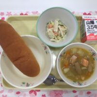 令和8年4月16日の給食 米粉パン 牛乳 ブイヤベース マカロニサラダ 今日の給食のブイヤベースはフランスの地中海地方の有名なスープ料理です。もともとは漁師さんがとれたての魚を大きな鍋に入れて作った料理で、今では魚やえび …