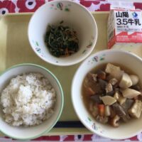 令和8年1月13日の給食 玄米入りごはん 牛乳 おでん ほうれん草のごまあえ 今日は、冬のごちそう「おでん」です。ご当地おでんとして、有名なのは、静岡の黒はんぺんと青のりと削り節のだし粉をかけたものです。姫路おでんは、し …