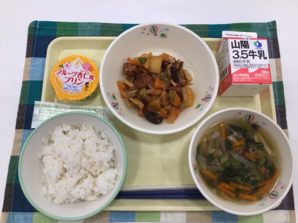 ごはん 牛乳 酢豚 きくらげのスープ 杏仁フルーツプリン
