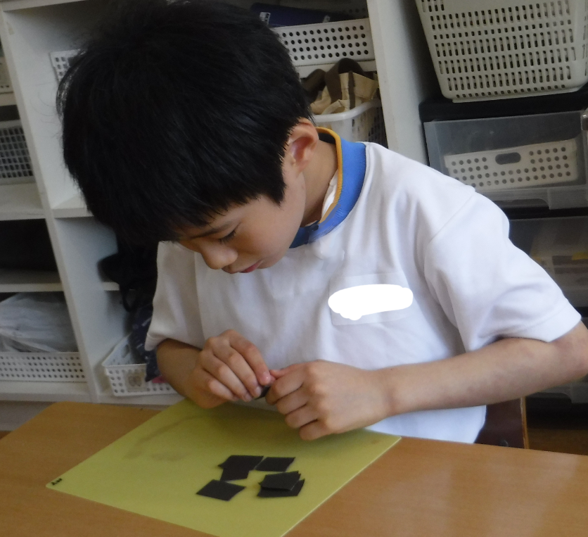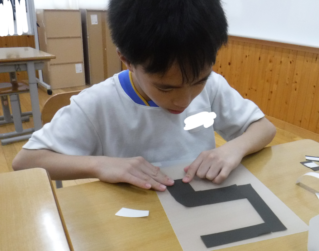 図工では、ステンドグラスライトづくりに挑戦中!プラスチック板に黒画用紙を張ってステンドグラスの模様を付けています。