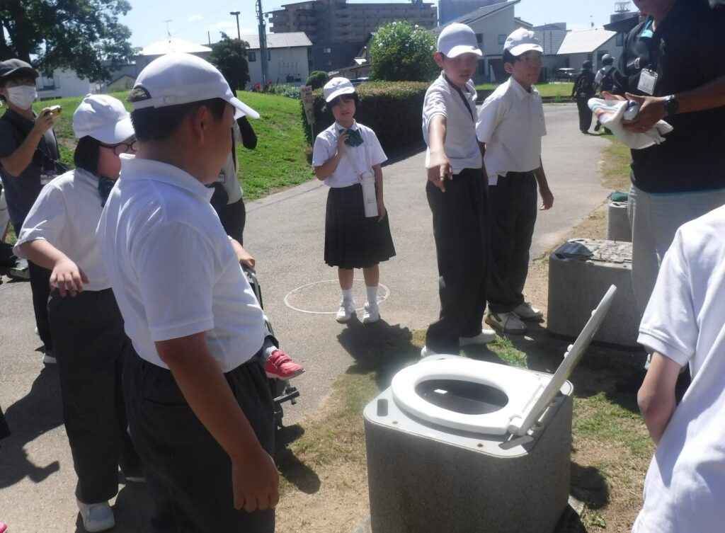 かまどベンチや防災トイレを見ながら話を聞くことができました。