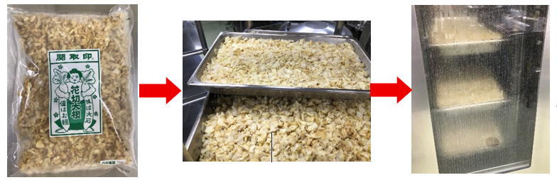 岡山県産の大根を使った花切りだいこんは、水でもどした後、スチコンで蒸します。