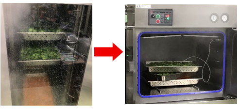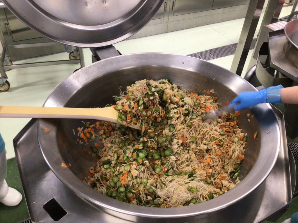 他の野菜やいかは、別々にスチコンで蒸した後、真空冷却器で一気に冷やします。