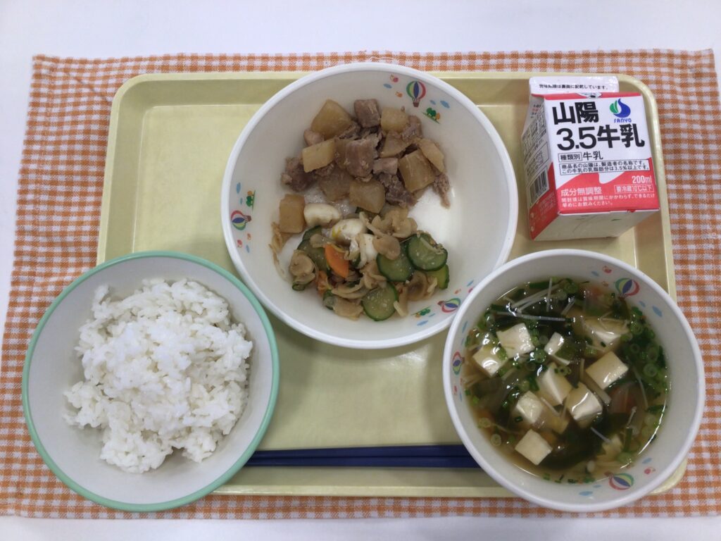 ごはん 牛乳 豚肉と大根のしょうが煮 かむカム和え わかめ汁