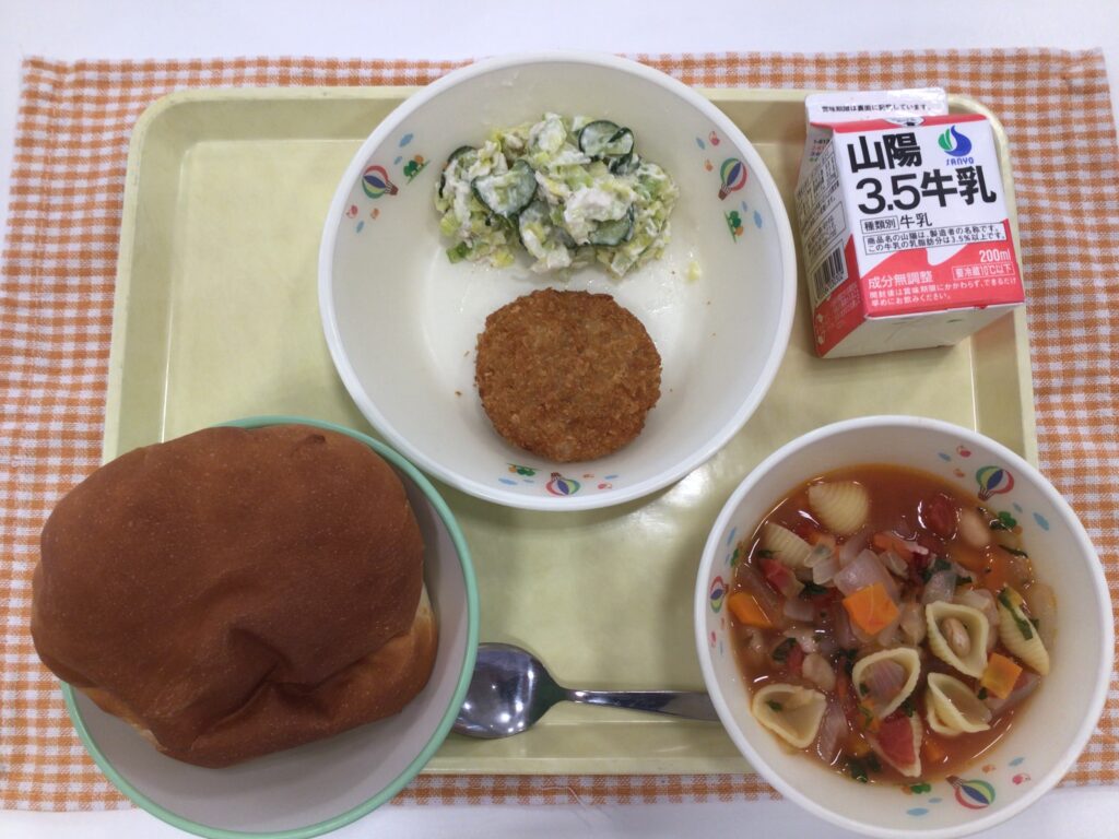 米粉パン 牛乳 れんこんコロッケ アンのチキンサラダ ミネストラスープ