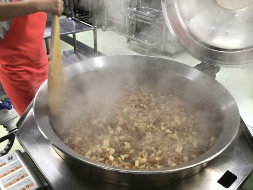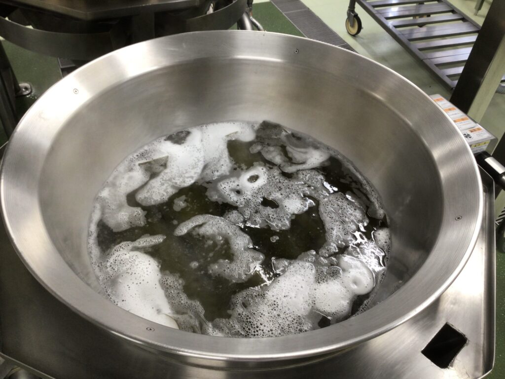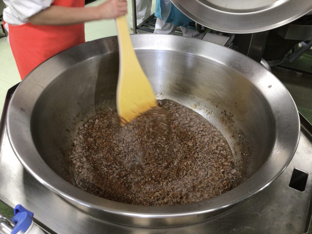 2つの釜で、おでんの具をだし汁と調味料で炊きます。具材が煮えたら、肉みそを加えて混ぜ合わせ、できあがりです。