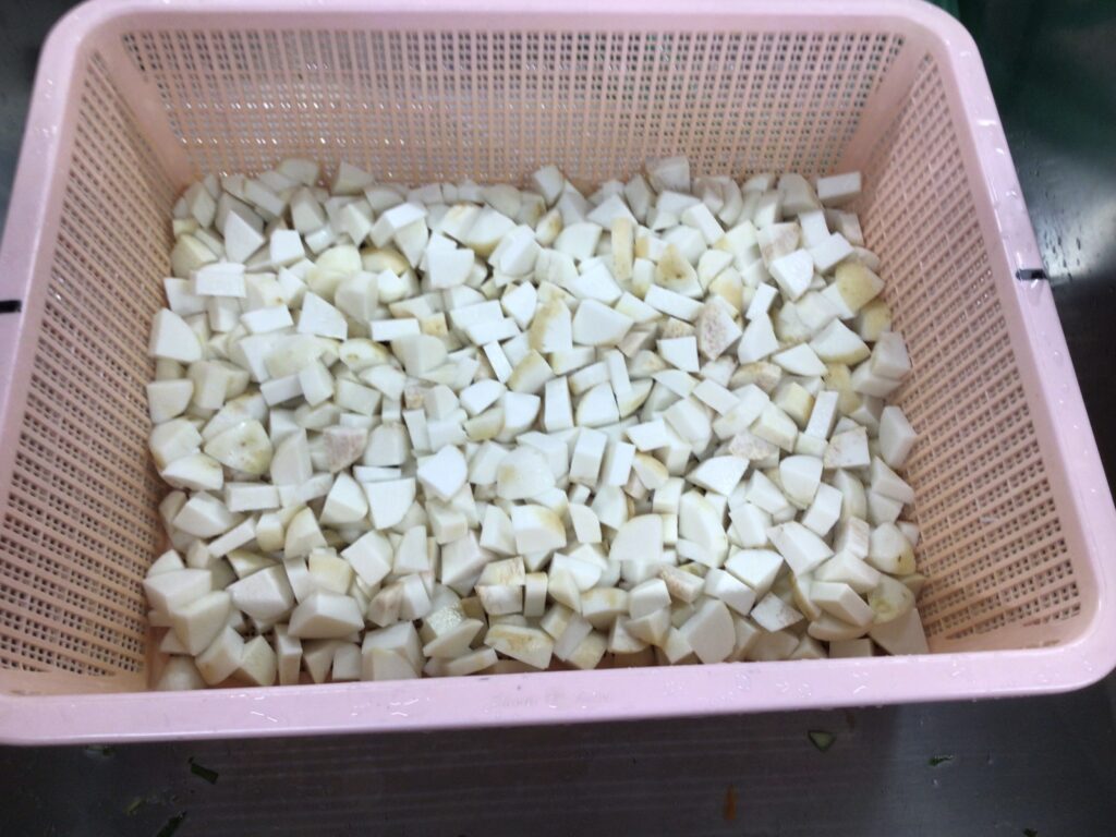 さといもは、一つひとつ包丁で切ります。大きさをそろえると、煮え方が同じになり、おいしく味つけすることができます。