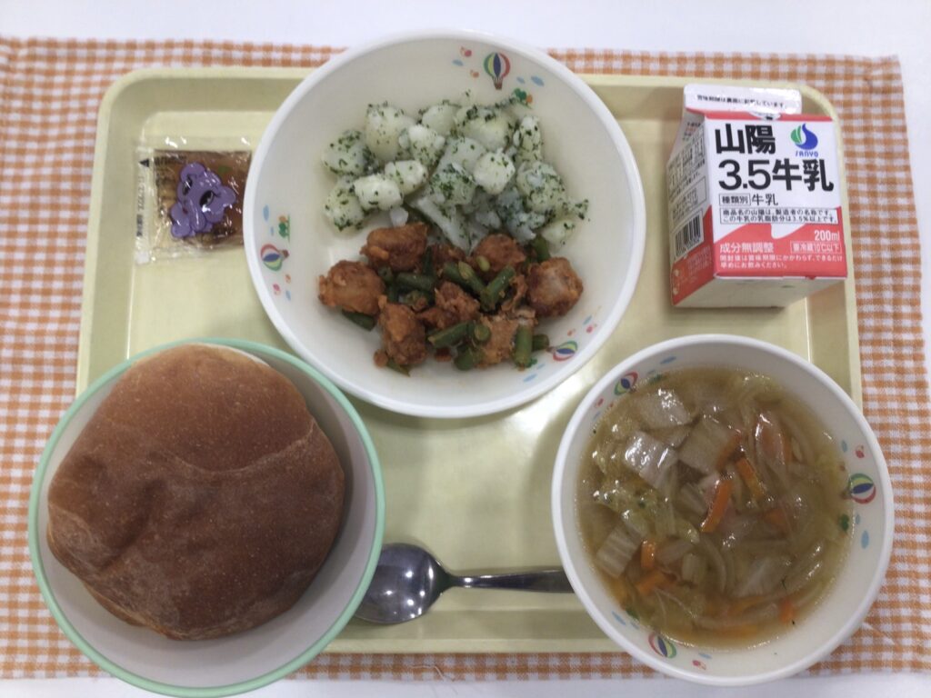 米粉パン 牛乳 まぐろのオーロラソース のし塩ポテト コンソメスープ ジャム
