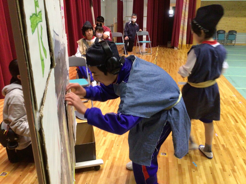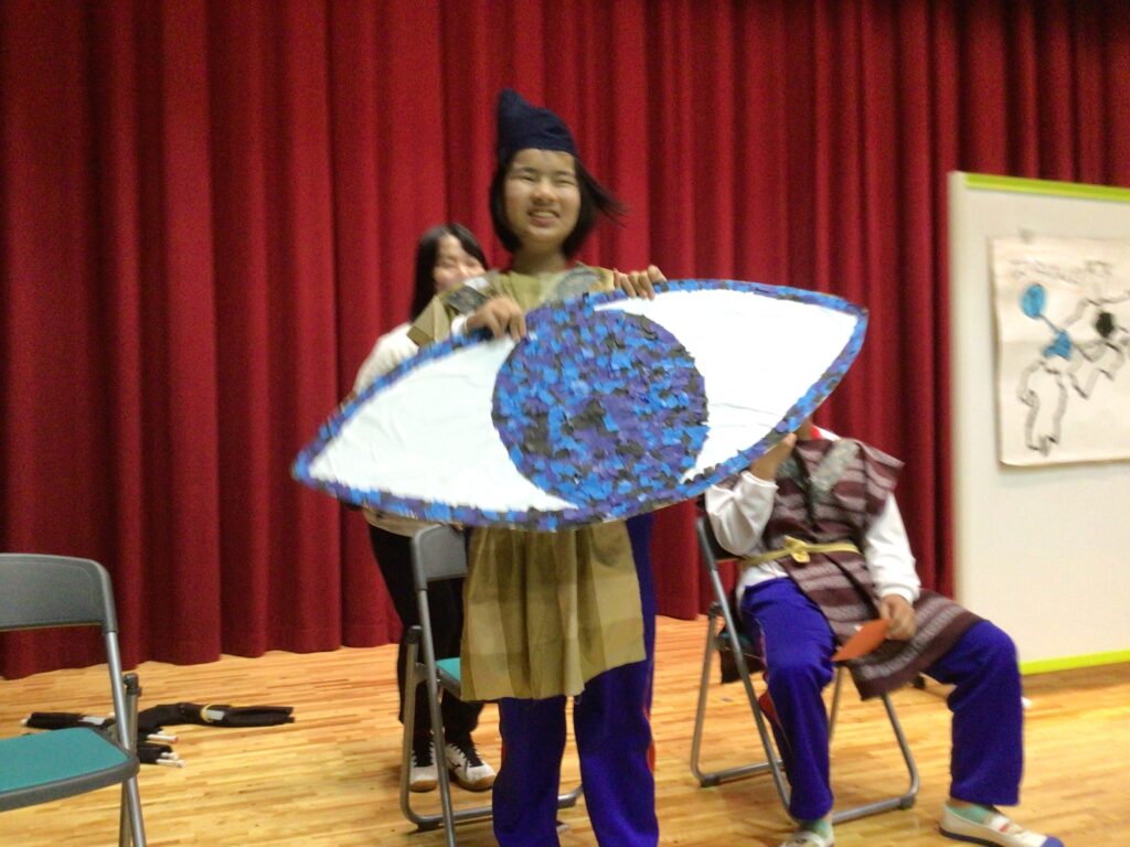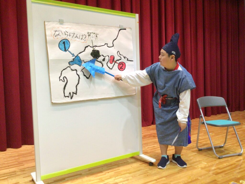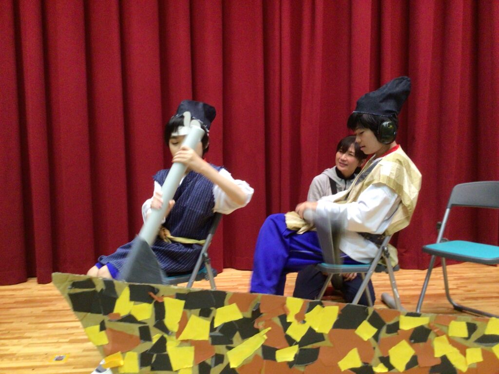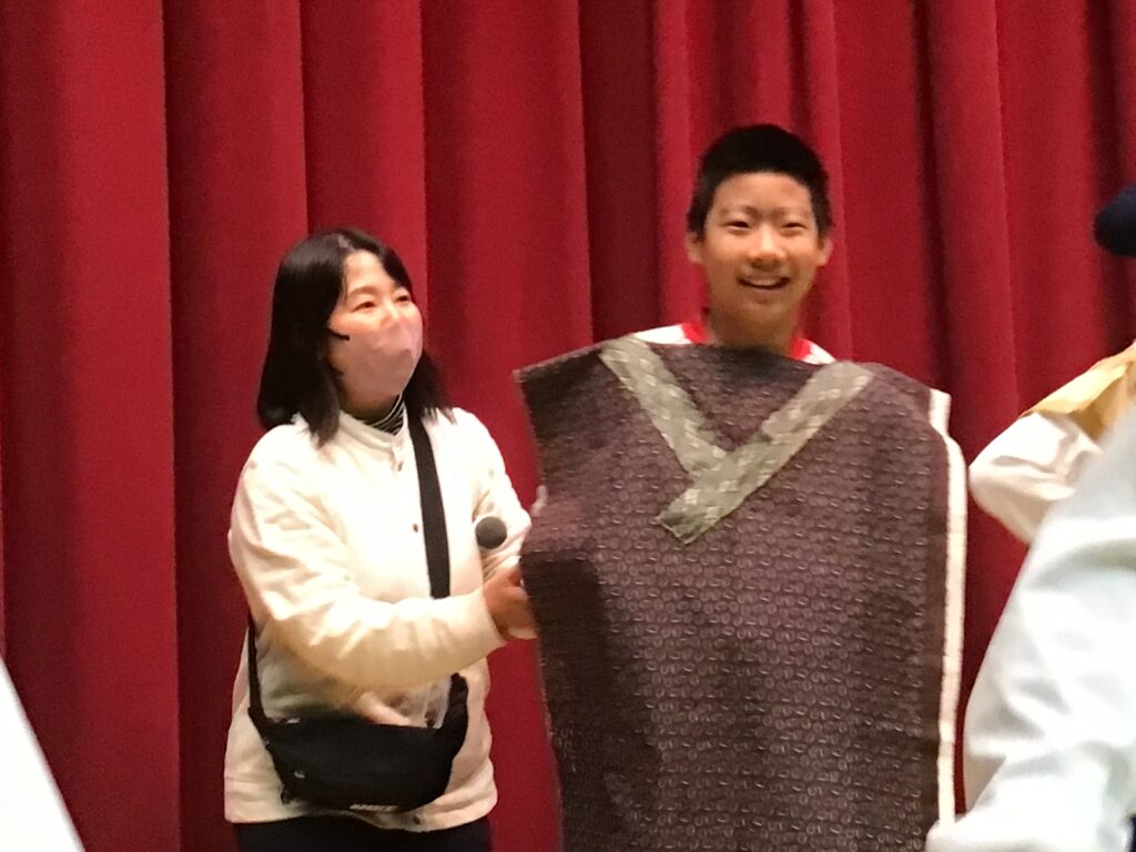 A中1年生は、総合的な学習で真備町の偉人である「吉備真備」を学習し、そのまとめを文化祭のステージで発表をしました。