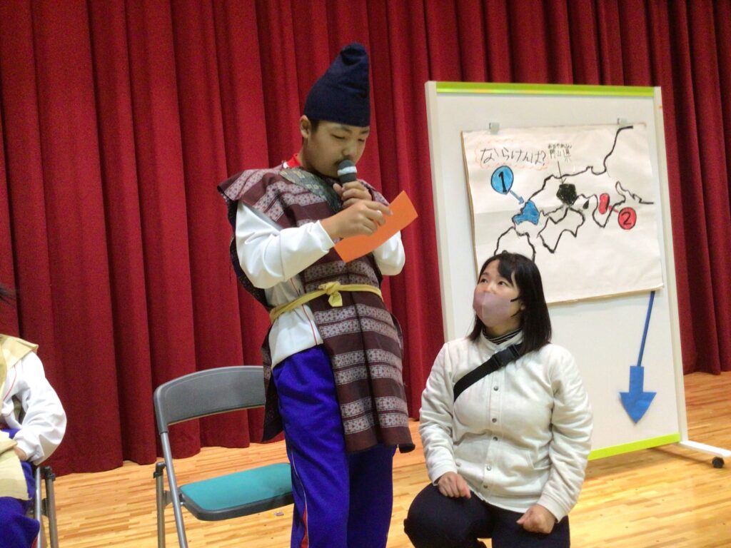 1組は、吉備真備公が遣唐使船に乗って唐へ行った場面を。2組は、吉備真備公が唐で学んで日本に持ち帰ったものを。3組は、吉備真備公が造った東大寺についてクイズ形式で発表をしました。そして、フィナーレはA中オリジナルの「キビノマキビクス」を全員で踊りました。