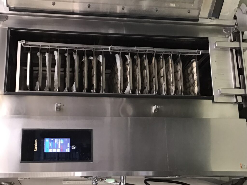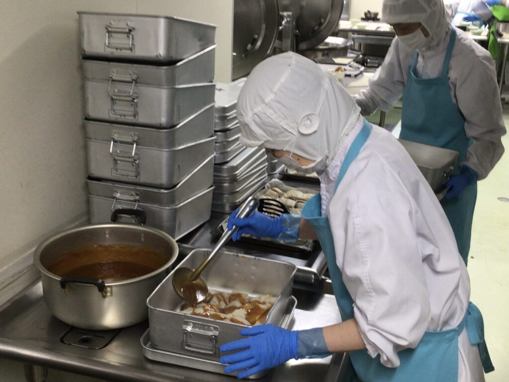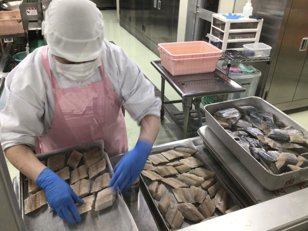 スチコンで鉄板23枚を使って焼いた後、さわらの上からゆずみそのたれをかけてできあがりです。