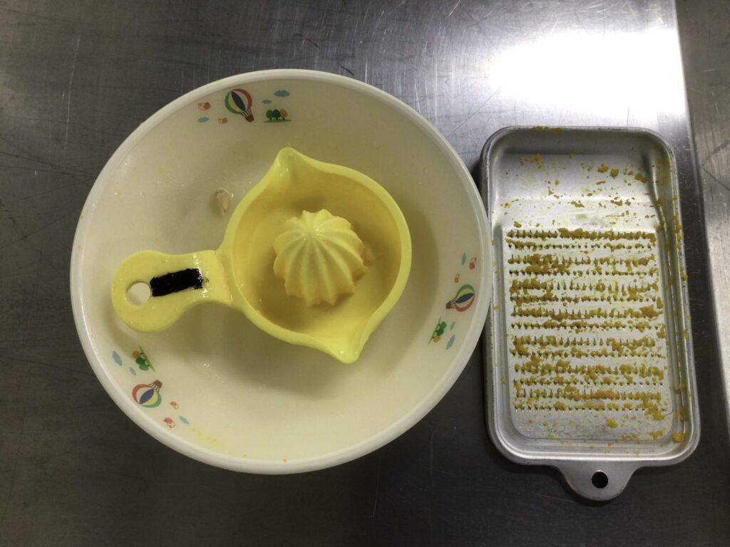 ゆずは、皮の部分をおろし金ですりおろし、半分に切ってしぼります。皮のすりおろしを加えることで、香りがよくなります。