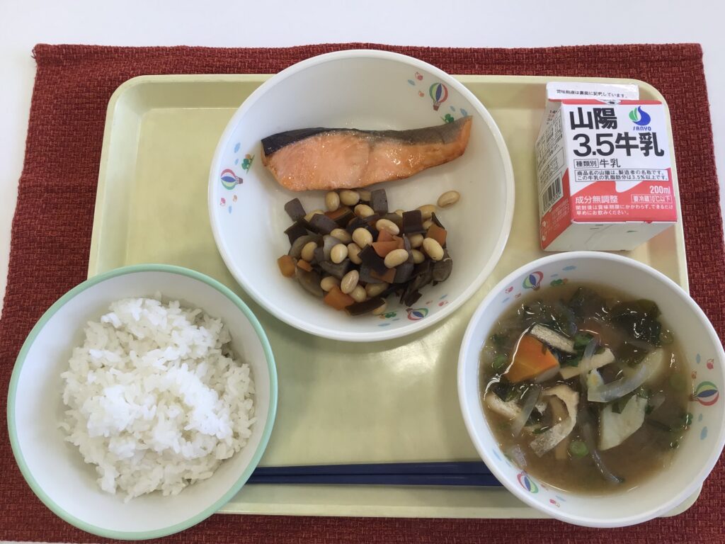 ごはん 牛乳 さけの塩焼き 五目豆 じゃがいものみそ汁