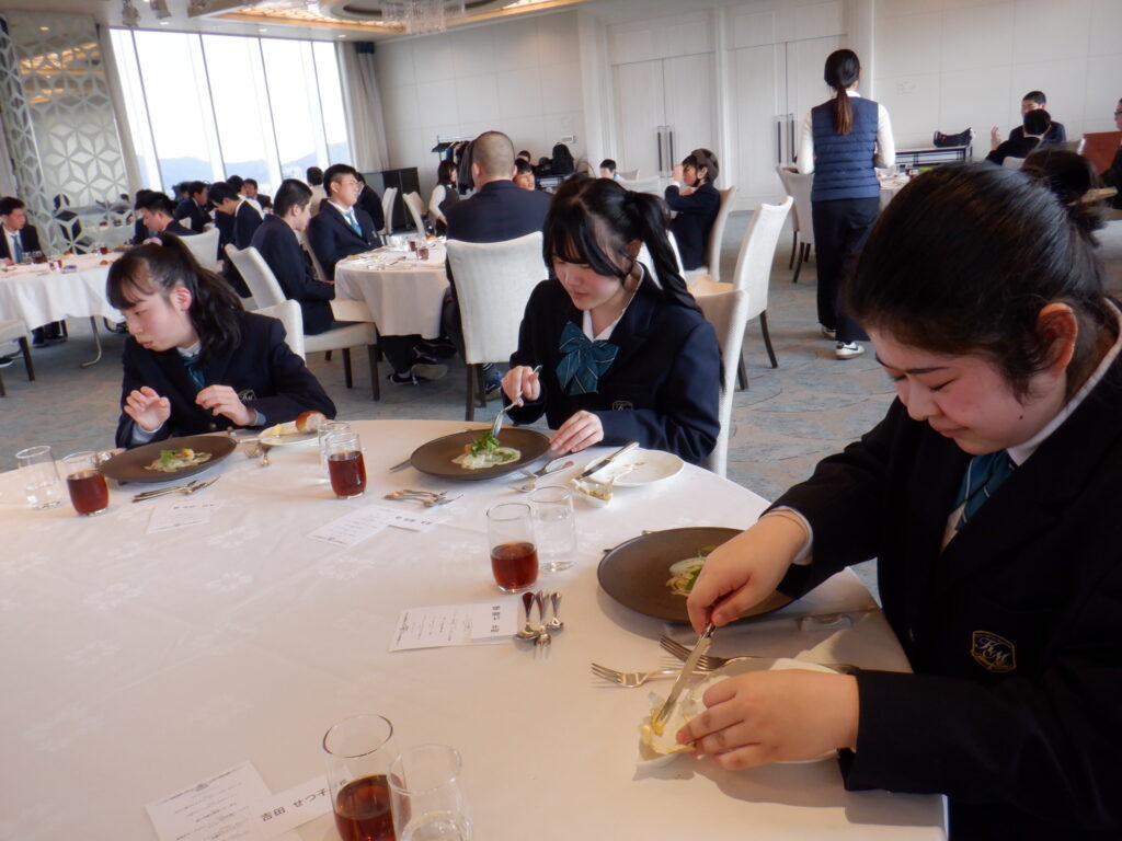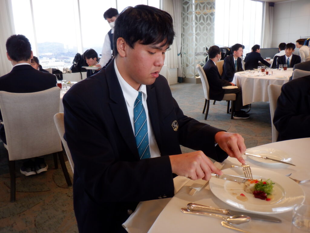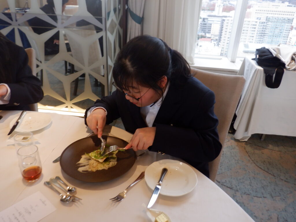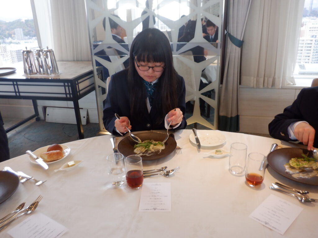 テーブルマナーは岡山に移動し、ANAクラウンプラザホテルで行いました。最初にバナナをナイフとフォークで食べるレッスンを行なったり、フォークやナイフの使い方や置き方、ナフキンの使い方や食事の進め方などを丁寧に教えていただいたりしながらの食事となりました。ナイフとフォークを使いながら、次々に出てくるすばらしいコース料理を楽しむことができました。とても貴重な経験をすることができました。