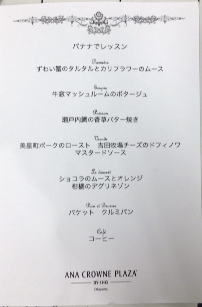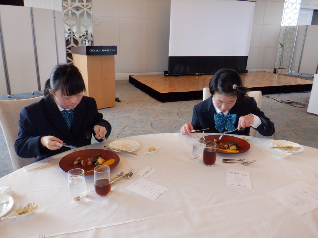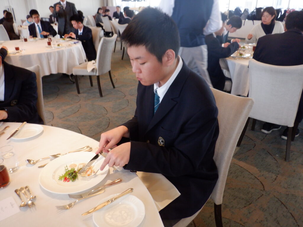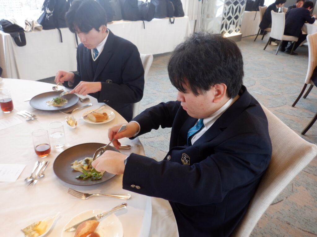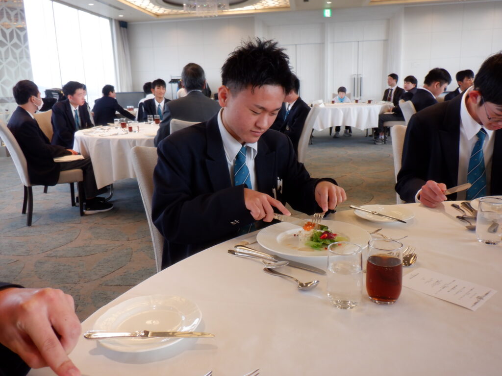 テーブルマナーは岡山に移動し、ANAクラウンプラザホテルで行いました。最初にバナナをナイフとフォークで食べるレッスンを行なったり、フォークやナイフの使い方や置き方、ナフキンの使い方や食事の進め方などを丁寧に教えていただいたりしながらの食事となりました。ナイフとフォークを使いながら、次々に出てくるすばらしいコース料理を楽しむことができました。とても貴重な経験をすることができました。