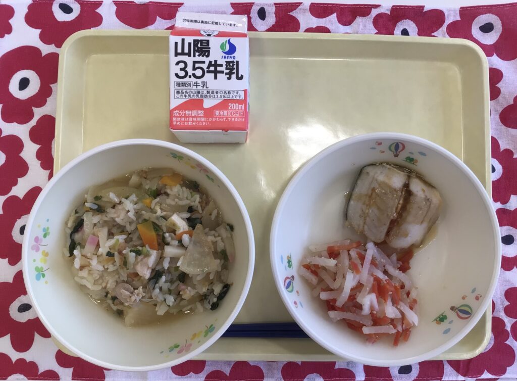 七福雑炊 牛乳 さわらの照り焼き 紅白なます