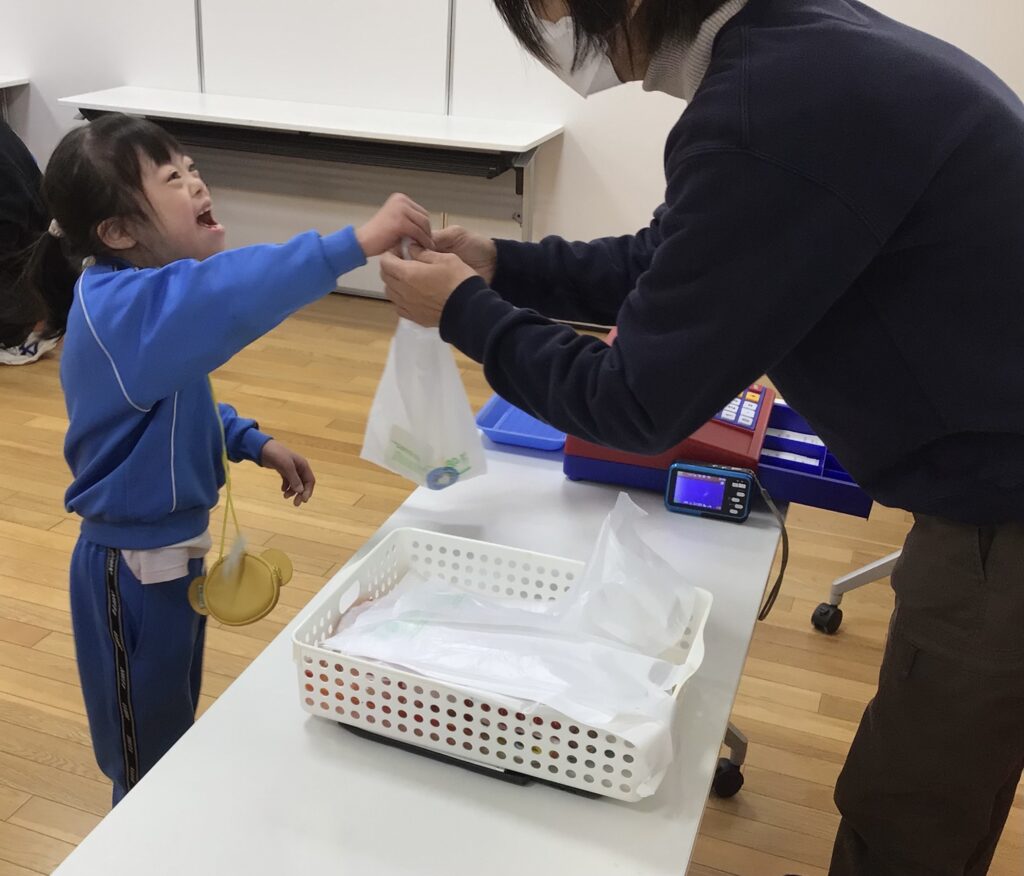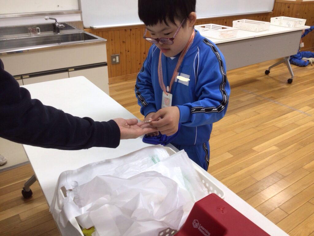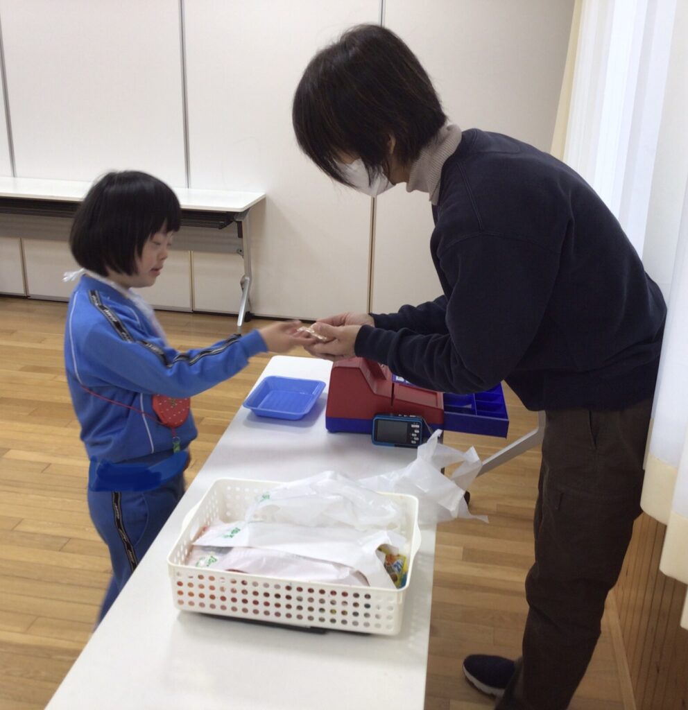 模擬銭を払って、レシートを受け取り、買ったものを大切に教室まで持ち帰り、みんなで食べました。自分で買ったお菓子はいつも以上においしかったと思います。