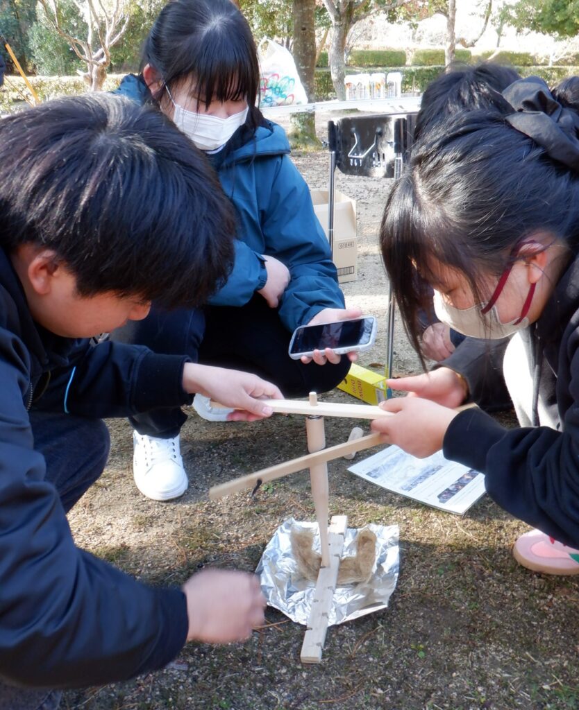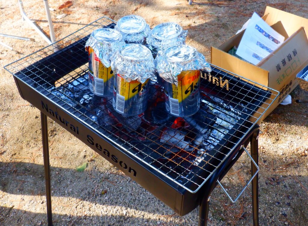 防災学習で学んだことを生かし、アルミ缶を使ってご飯を炊いたり、水で作ったカップラーメンの試食をしたりしました。