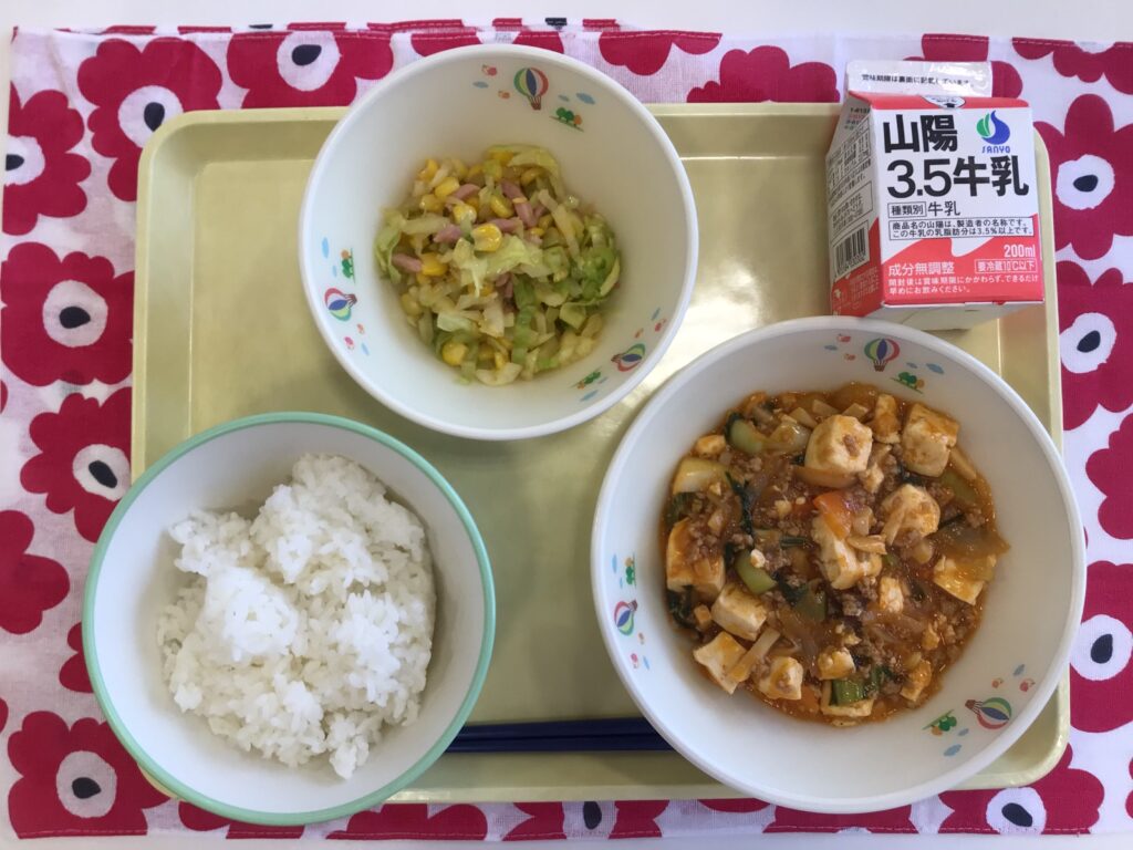 ごはん 牛乳 豆腐のチリソース煮 キャベツとコーンのサラダ