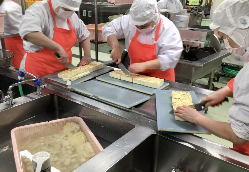 じゃがいもや焼き豆腐は、包丁で切ります。