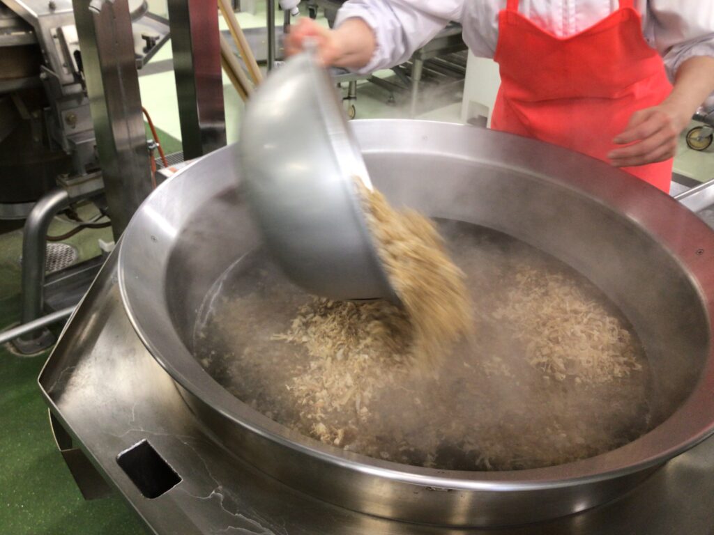 焼き豆腐とみそなどの調味料を加えてさらに煮た後、さけを加えます。