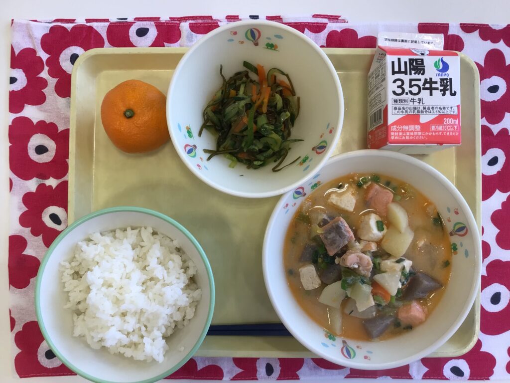 ごはん 牛乳 石狩鍋 昆布のあえ物 みかん