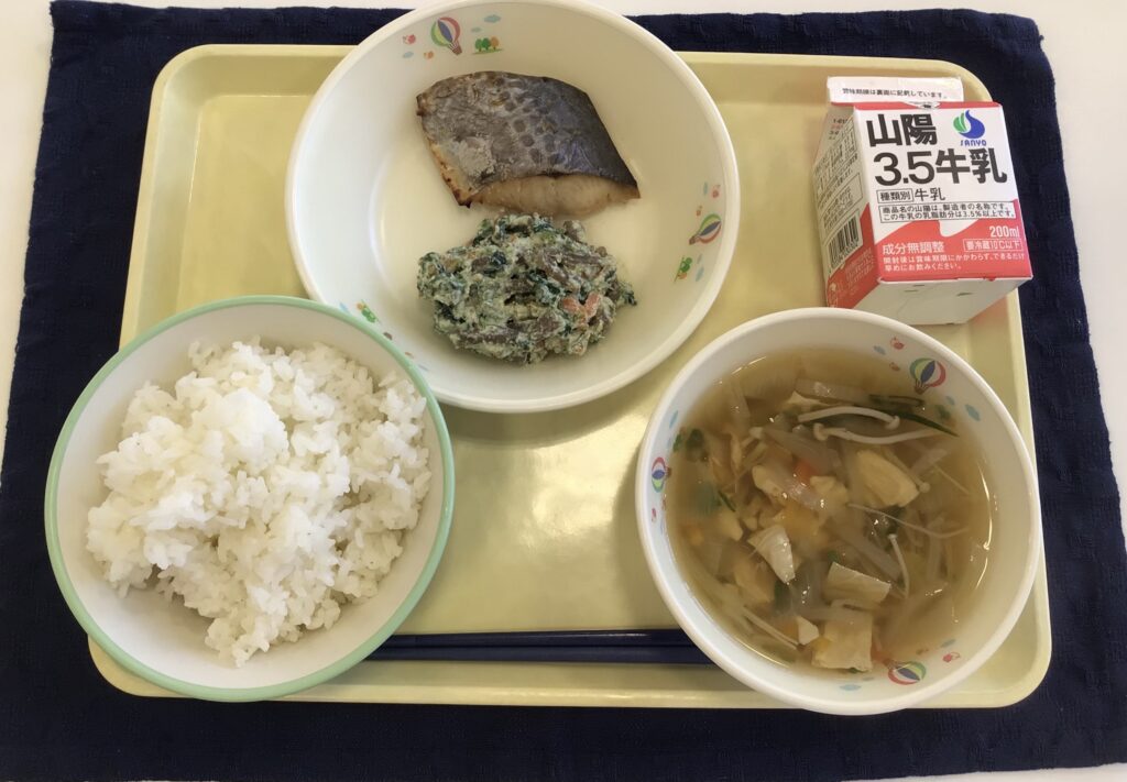 今日はさわらの幽庵焼きです。江戸時代の茶人の北村祐庵という人が考えたことから、この名前がつきました。さわらに、ゆず・しょうゆ・酒・みりんで下味をつけてオーブンで焼きました。白和えは、豆腐とごまや白みそを合わせて作った和え衣で、野菜やこんにゃくなどの食材をあえる和食の料理です。