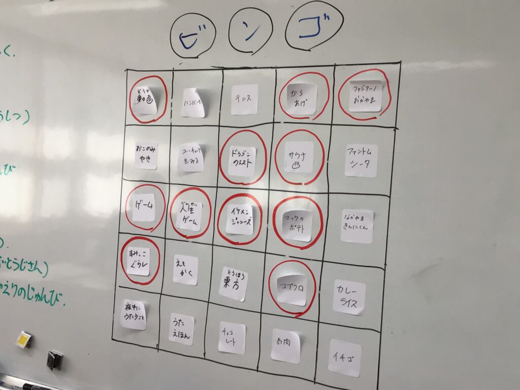 生徒、教員が書いた趣味や好きな食べ物をホワイトボードに貼り付け、それぞれが誰が書いたものなのかをみんなで当てていきました。