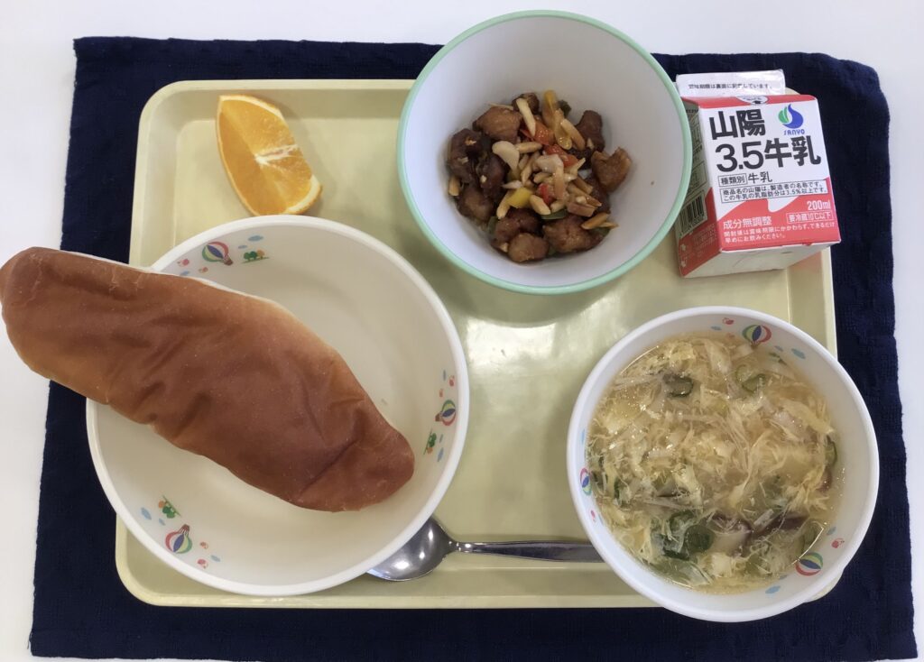酸辣湯とは中華料理のスープで、酢の酸味と唐辛子やこしょうの辛みをきかせ、最後に卵を加えて作るスープです。酸味と辛みがきいた風味豊かなスープです。中華麺を加えて酸辣湯麺として食べることもあります。給食では唐辛子は入れていませんが、ラー油を加えることで辛みを少しきかせています。