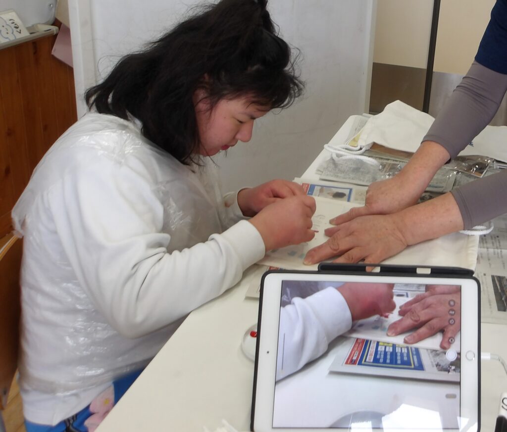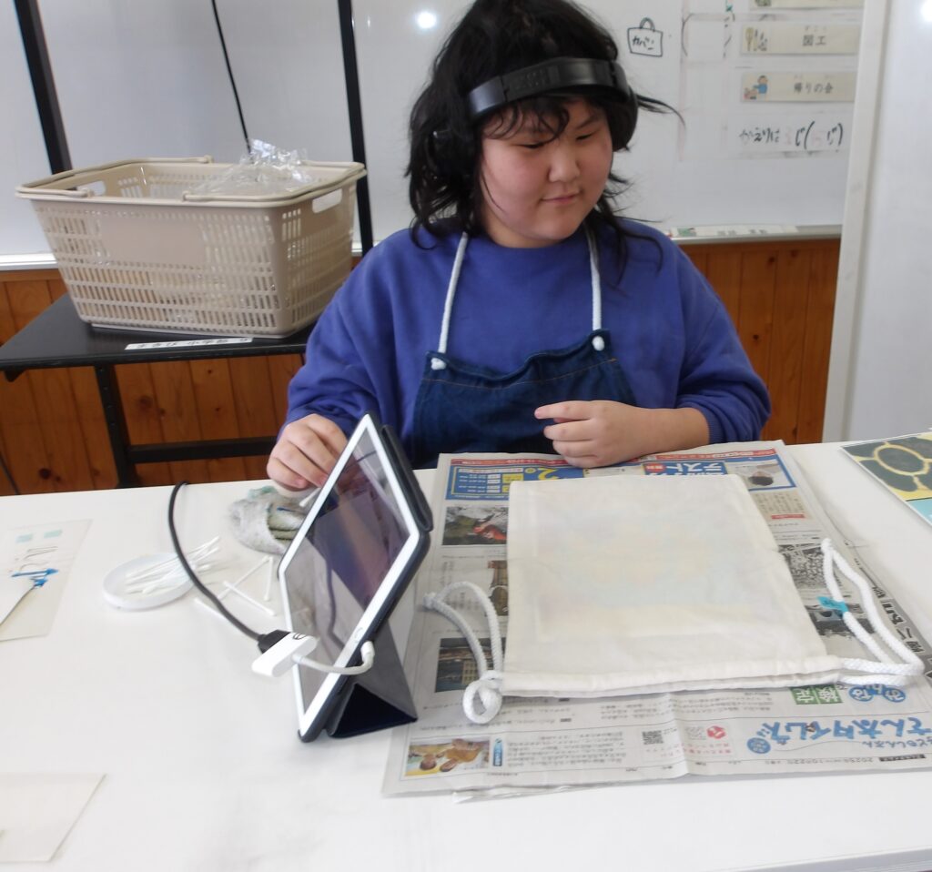 図工では、卒業制作としてステンシルを使ったオリジナルの袋等を作っています。