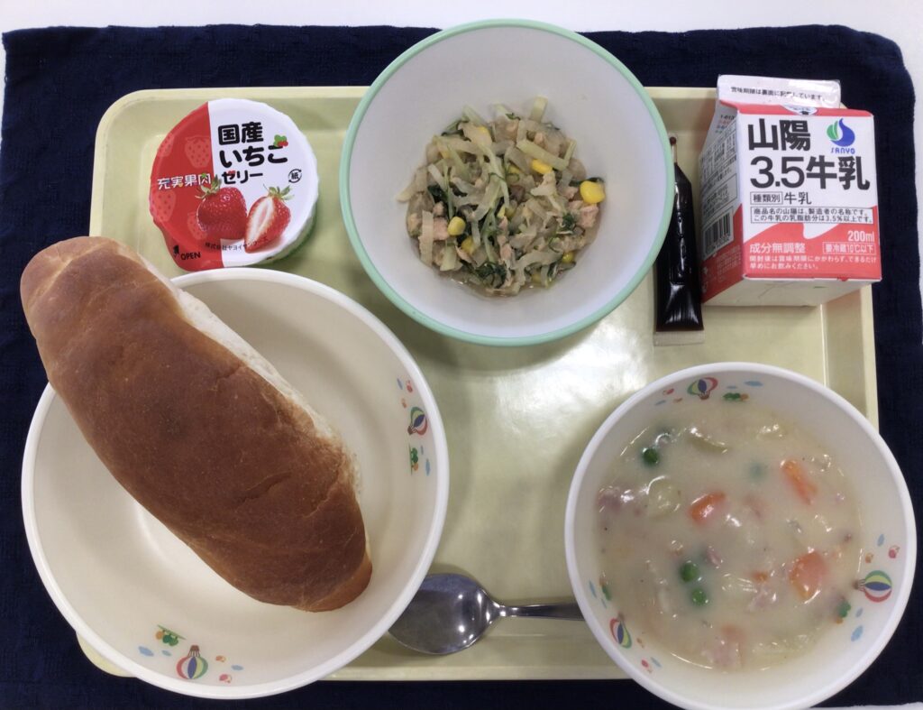 米粉パン 牛乳(コーヒー味) 豆乳チャウダー 水菜とツナのサラダ いちごゼリー