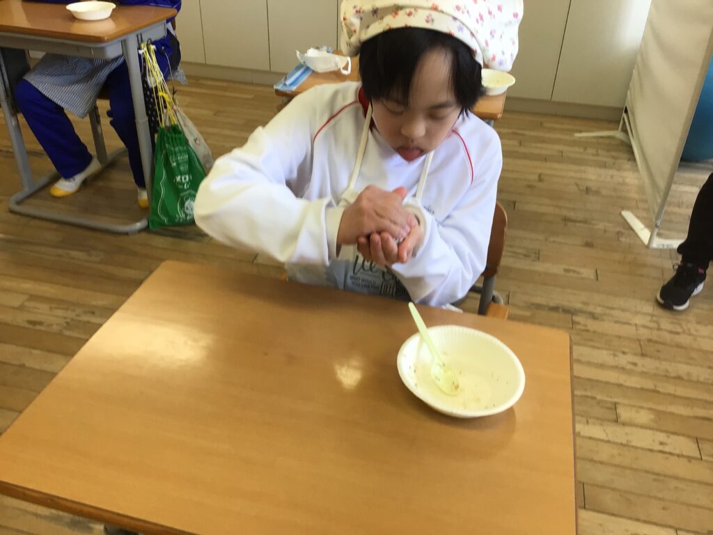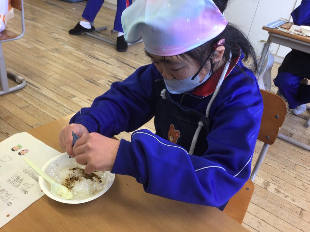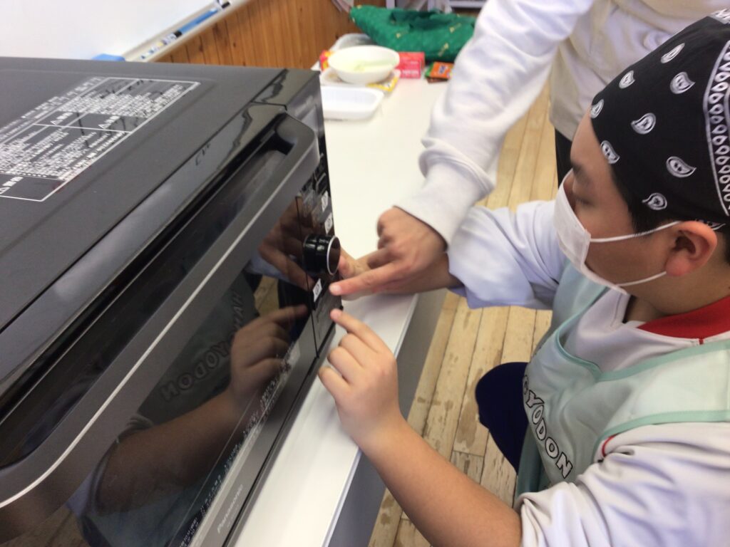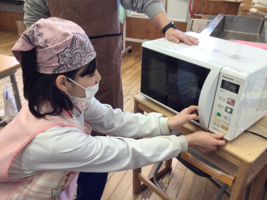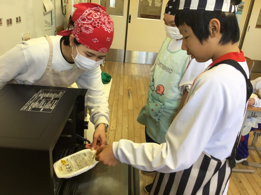 家庭科の授業で電子レンジを使って、パックご飯を温めておにぎりを作りました。