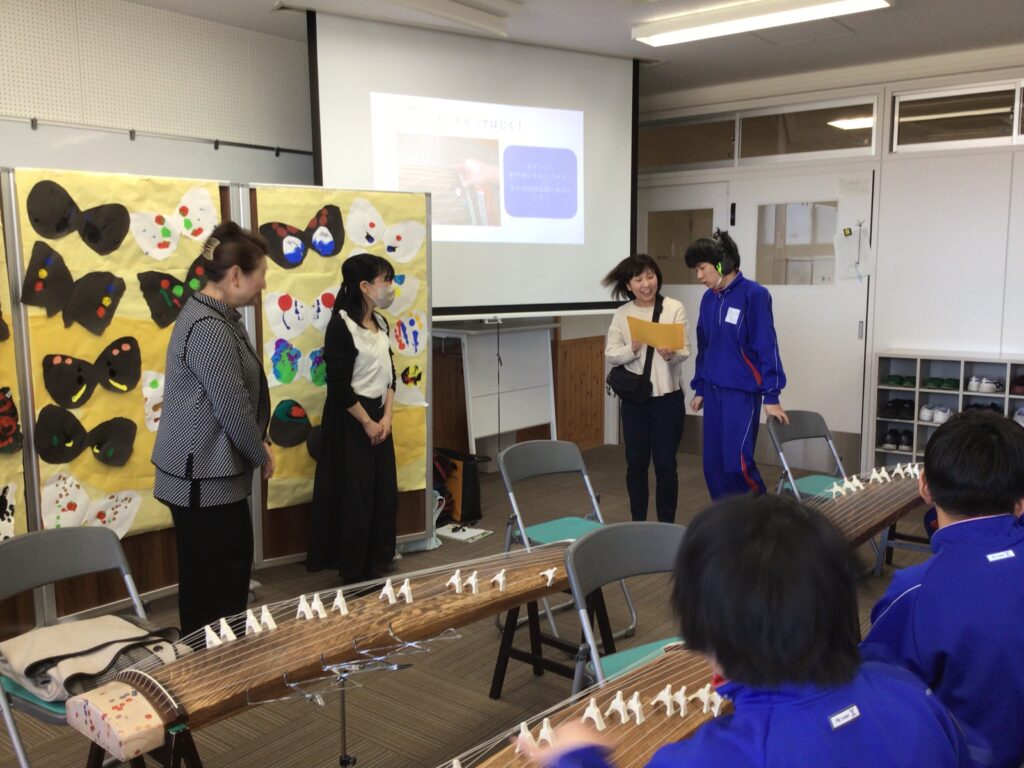 A中2年生は、総合、音楽、美術で日本文化について学習しました。今日は講師の先生をお招きして、琴の演奏を聴かせていただきました。みんながよく知っているアニメの曲や「さくらの変奏曲」などを弾いてくださり迫力のある演奏に生徒は聴き入っていました。また、音楽で練習した「さくら」を講師の先生と一緒に演奏することもできました。