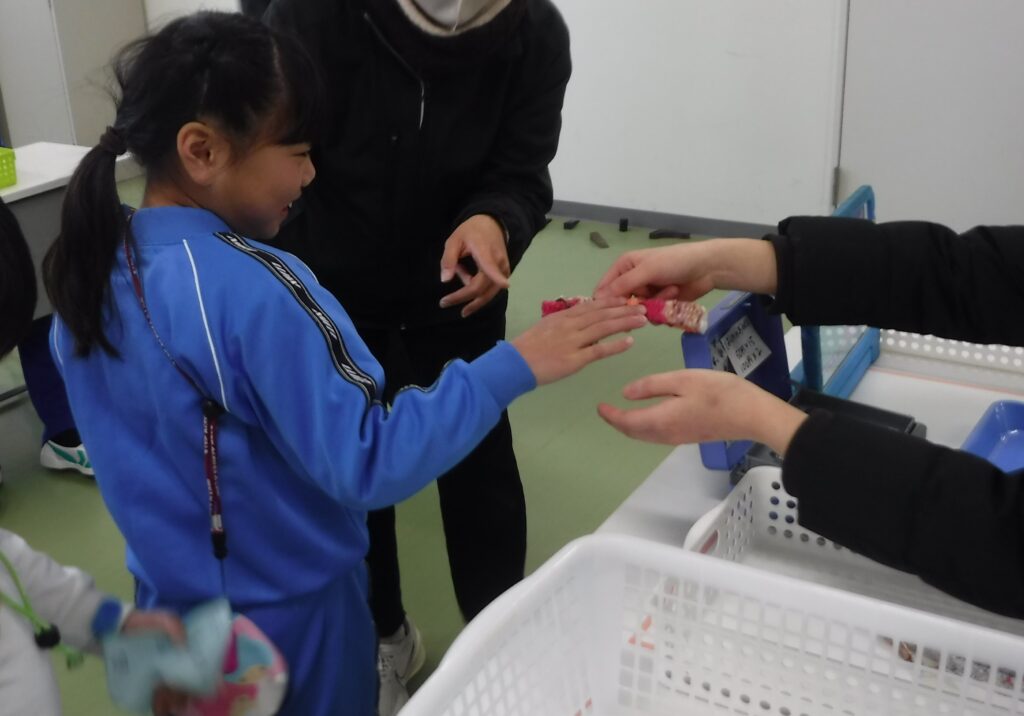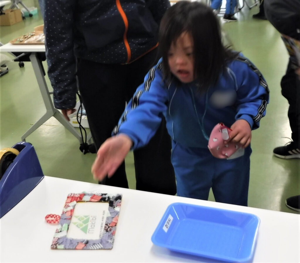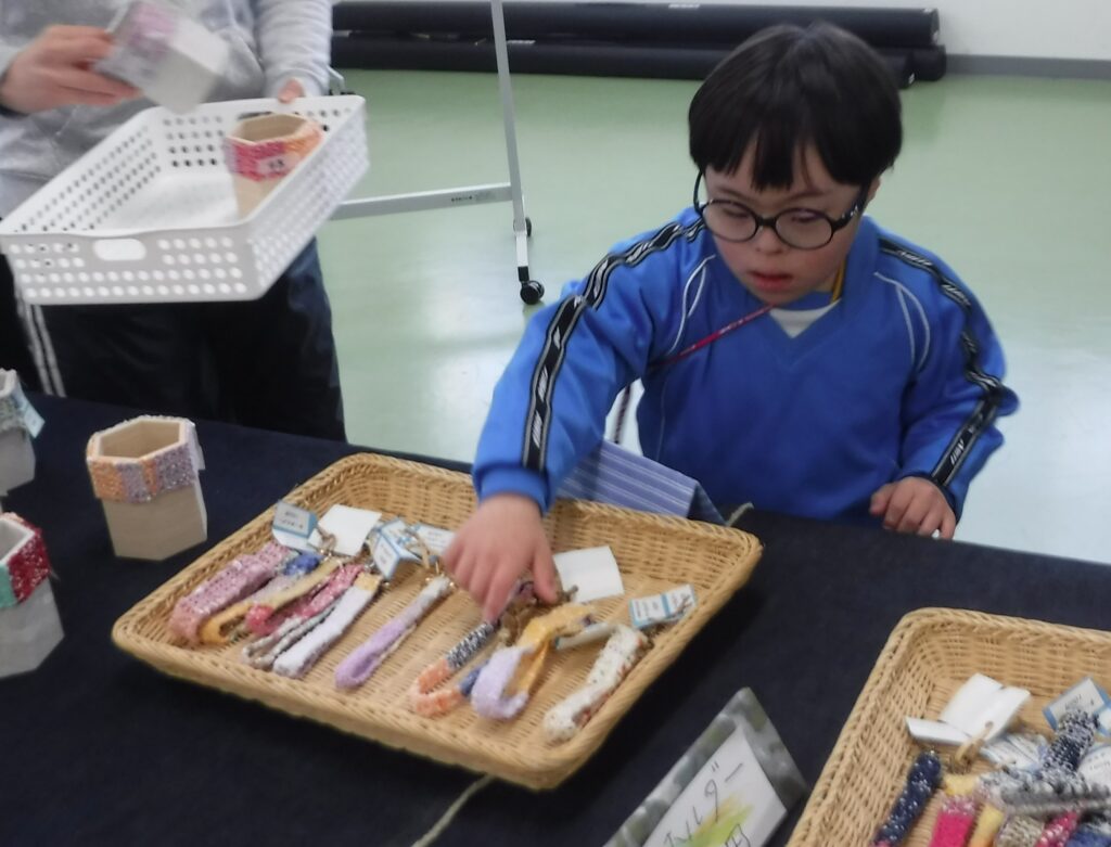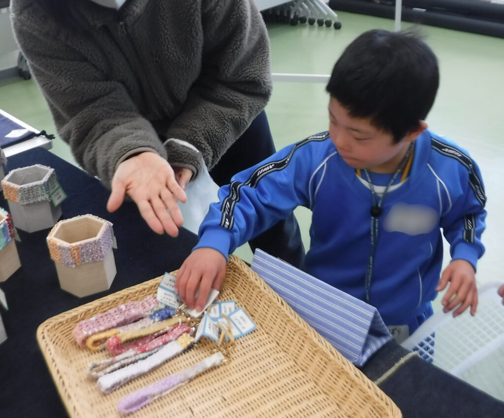 先日、中学部の商品を買いに行きました。素敵な商品が沢山あり、どれにしようか悩みながら買い物をすることができました。繰り返し買い物学習に取り組んだことで、お金を出して、商品を受け取るまでの動作がスムーズにできるようになりました。