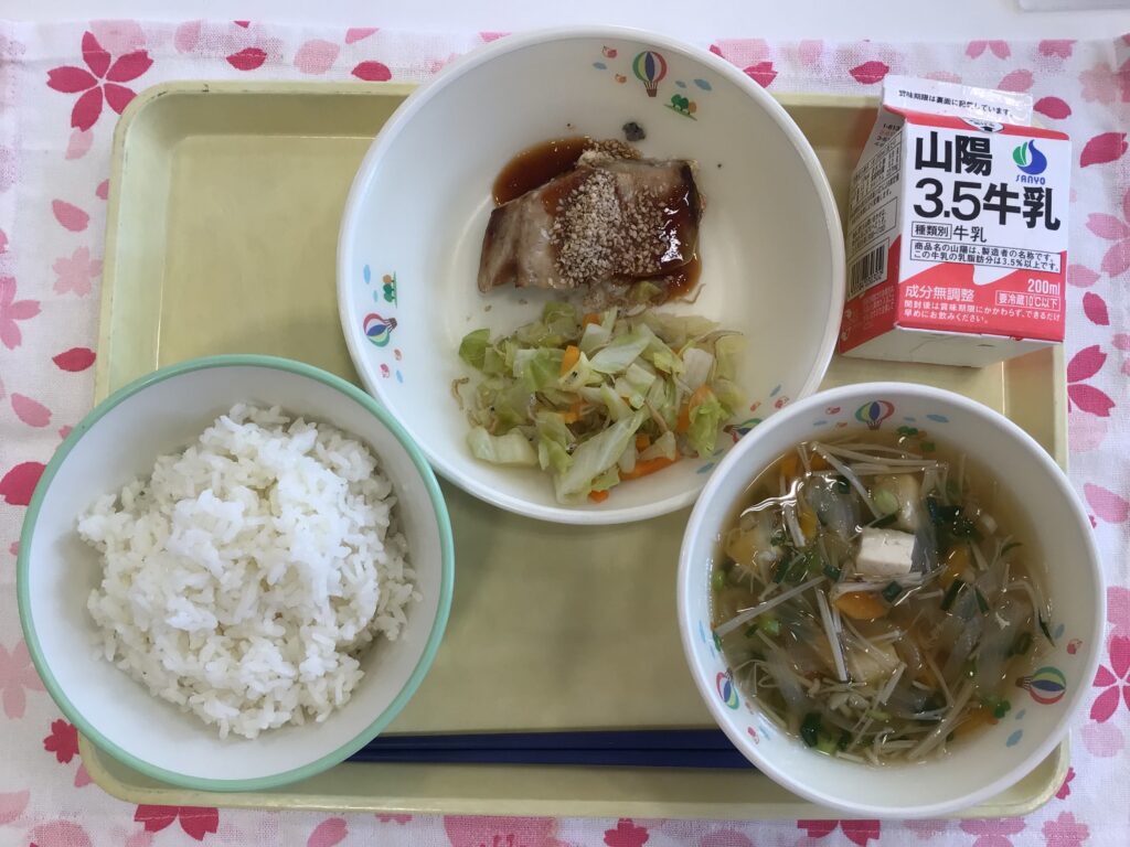 みなさん入学・進級おめでとうございます。今日から給食が始まりました。 今月の給食目標は、「みんなで楽しく食べよう」です。新しくすわる場所や給食を取りに行くところ、片付ける場所など覚えることができましたか?みんなで楽しく給食を食べることができるように、お互いゆずりあいましょう。そして、新しい友達や先生と楽しい給食時間をすごしてください。