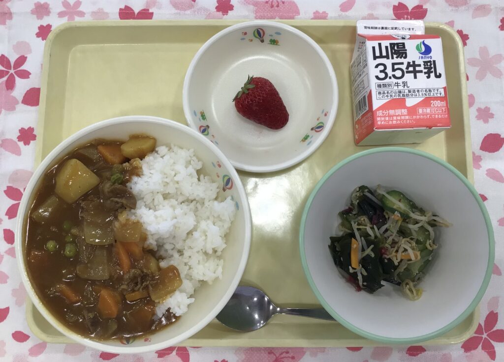 小学部1年生も今日から給食を食べ始めます。ということで、カレーライスです。いちごは、矢掛町の平井さんのいちごです。いちごにはビタミンCが多く体の調子を整えてくれます。倉敷まきび支援学校のみんなが、大好きなカレーライスといちごを小学部1年生も喜んで食べてくれたらうれしいですね。