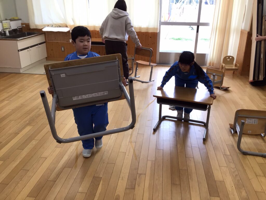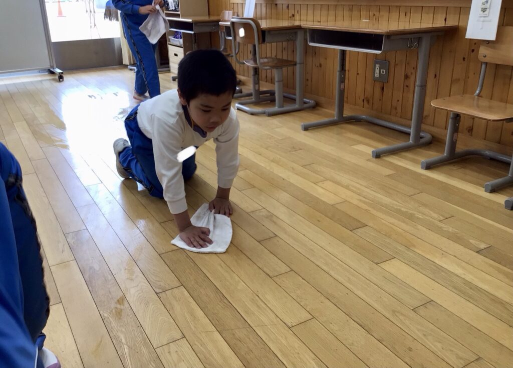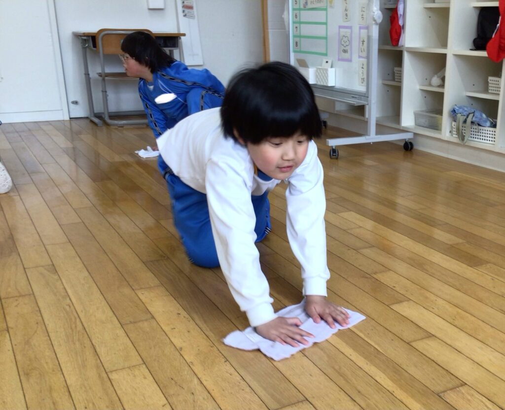 1年の終わりに、大掃除をしました。机を運び出して床の雑巾がけをしたり、ロッカーや机・椅子を拭いたりして、お世話になった教室がピカピカになりました。