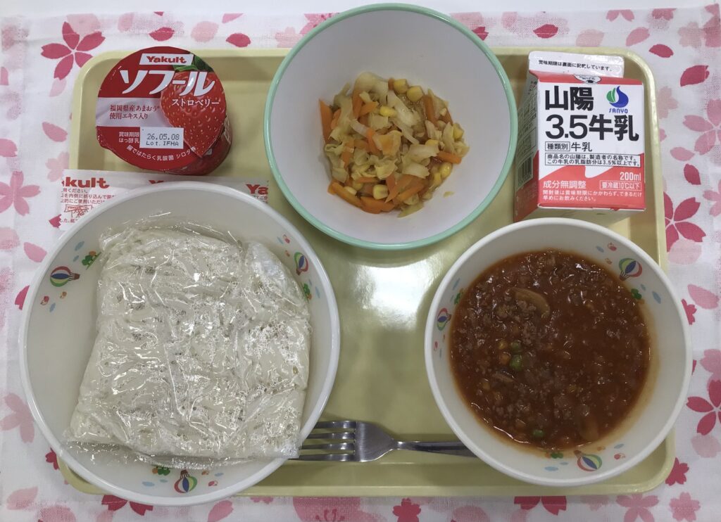 今日は、みなさんの大好きなスパゲティーミートソースです。スパゲティーミートソースは、学校給食独特のメニューとして大人になって、もう一度食べたい給食のナンバーワンと言われています。おうちの人に給食で好きだったものは、なんですか?と聞いてみてください。きっとスパゲティーミートソースの名前が出てきます。